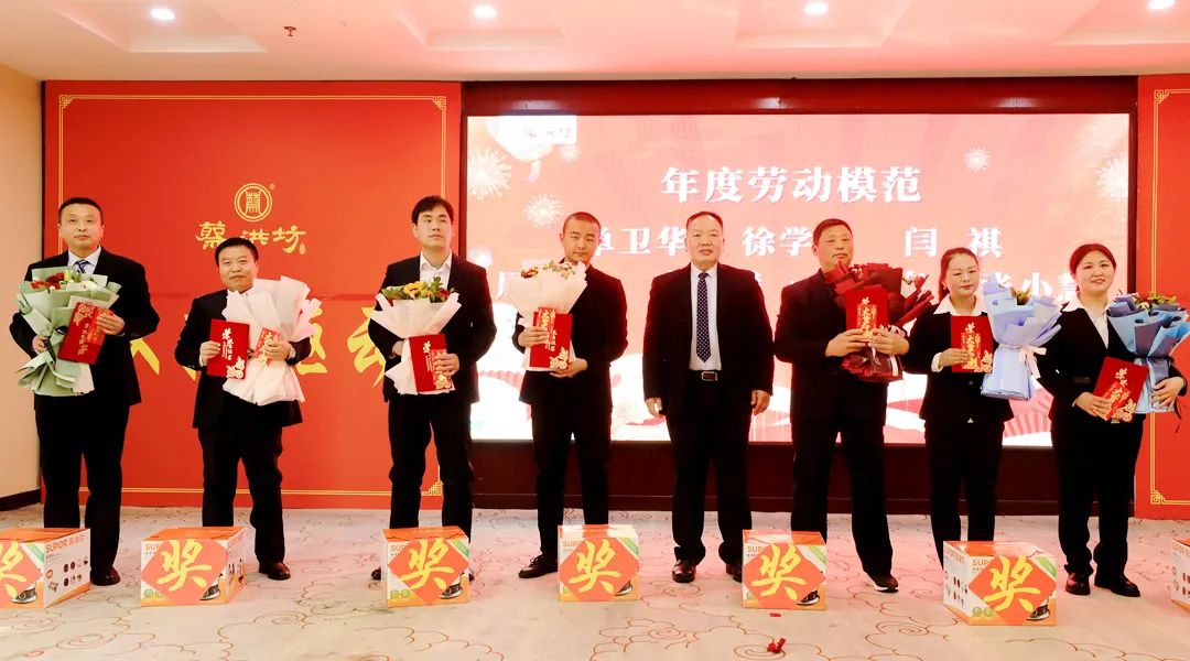 在表彰环节,公司党支部书记黄成国宣读了《蔡洪坊酒业关于表彰2021年度工作先进个人和先进集体的决定》。会议现场,对年度劳动模范、工作先进个人、最佳进步明星、最佳销售支持、销售会战之星、优秀管理者、年度销售标兵、年度优秀团队进行了隆重的表彰奖励。